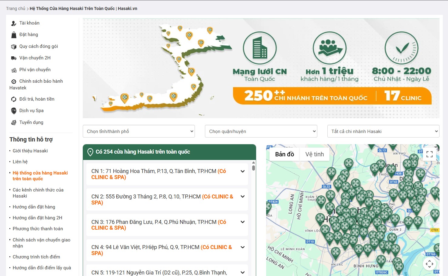 - Trang hệ thống cửa hàng sẽ hiển thị đầy đủ danh sách chi nhánh Hasaki trên toàn quốc. Quý khách vui lòng sử dụng bộ lọc theo tỉnh/thành và quận/huyện để tìm cửa hàng Hasaki gần nhất trong khu vực của mình, kèm theo địa chỉ chi tiết và bản đồ chỉ dẫn.