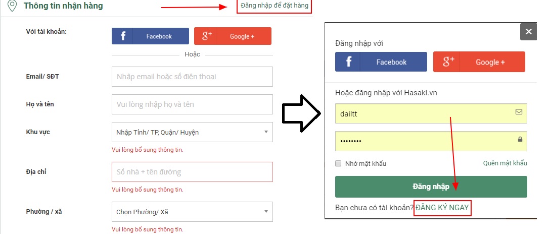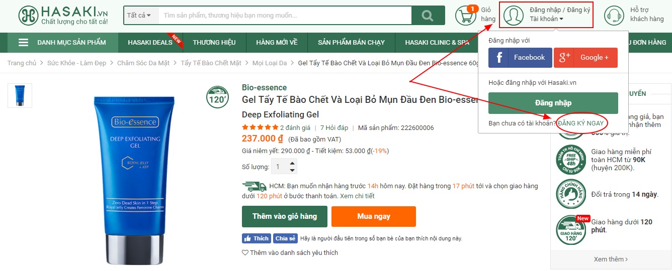 Quý khách vui lòng đăng nhập bằng tài khoản đã có ở Hasaki.vn hoặc đăng nhập thông qua Facebook hoặc tài khoản Google. Trong trường hợp chưa đăng ký tài khoản, quý khách có thể chọn dòng "Đăng ký ngay" và bắt đầu nhập địa chỉ email, mật khẩu tùy ý để đăng ký tài khoản.